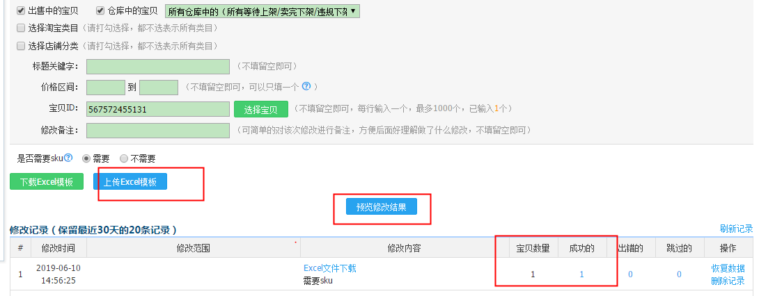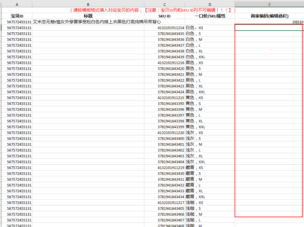商家编码匹配完成, 保证了商家编家的准确性,提升了操作速度,如商品增加颜色 或码数,也可以同样操作,进行批量修改操作