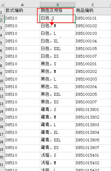 把【颜色及规格】列,剪切→粘贴 到 【商品编码】 列前面