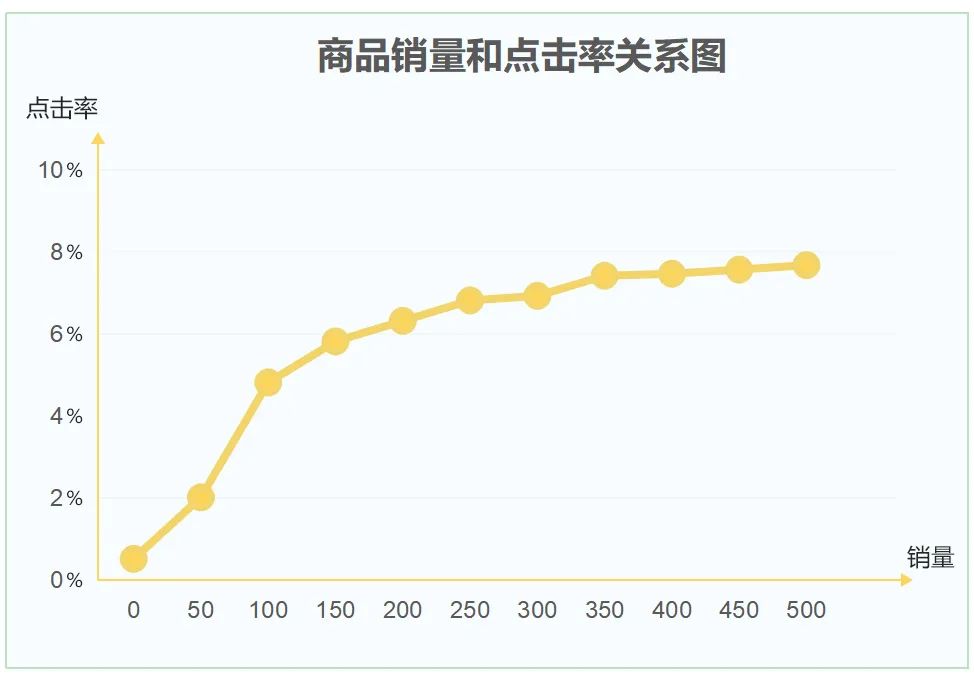 付款人数是影响商品点击率的重要指标。在商品信息没有任何调整的情况下,随着商品销量从0开始增加,点击率会快速地提高,然后趋于稳定。