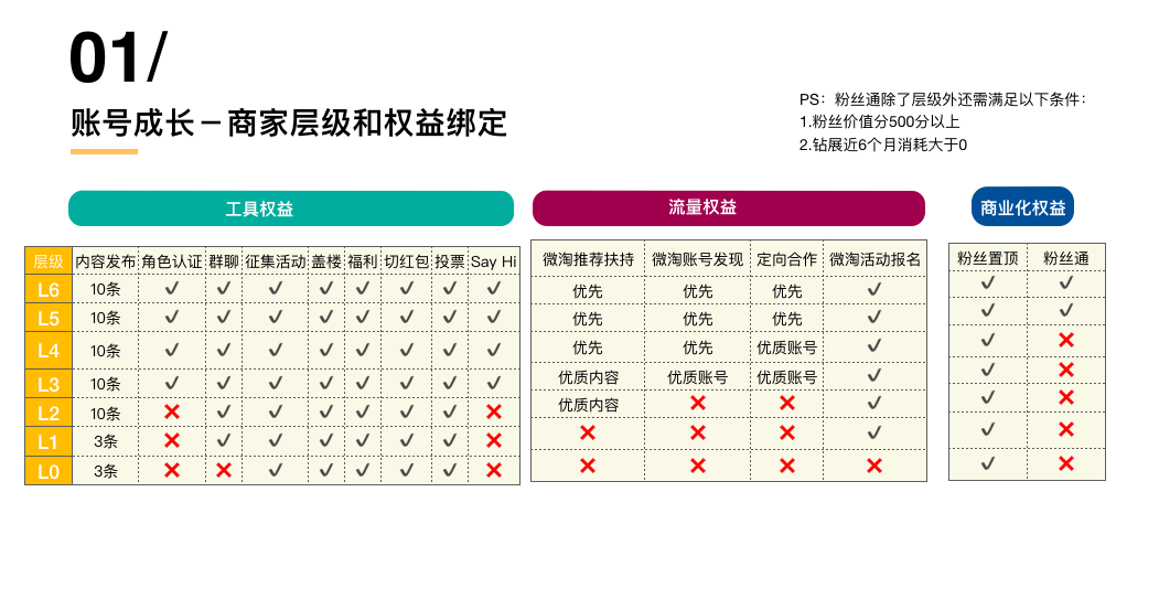三、各层级权益:对应等级权益开通时间内以阿里创作平台-微淘号·商家-我的等级-等级权益模块的解读为准。(还有更多权益待添加哦)
