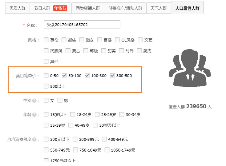 那么,已经出现标签被打乱的情况,该怎么办呢?这就是一个任重而道远的任务了,免费流量这一块不受你控制,唯一能受你控制的就是付费流量了,直通车的精选人群,有专门的针对消费层级引流的地方,那就是人口属性人群的“类目笔单价”,看下图: