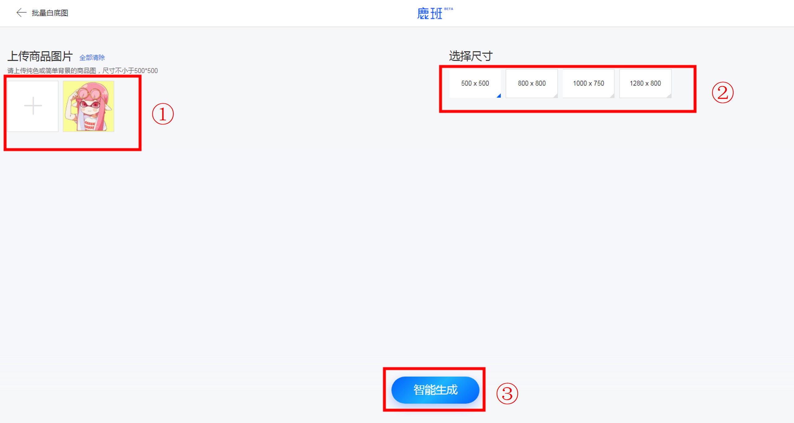 2、点击“+”号上传需要抠图的商品图,选择好需要得到的抠图尺寸后,点击“智能生成”;