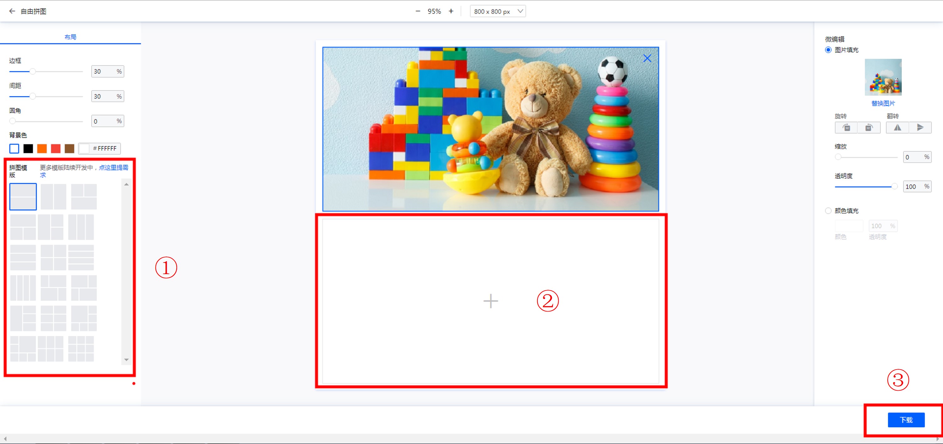 3、上传完成后,可在左侧选择“边框”、“间距”、“圆角”,“背景色”等内容进行布局调整,也可在右侧的微编辑页面对填充素材进行“缩放”、“旋转”、“翻转”等内容调整,调整完成后,点击下载即可!