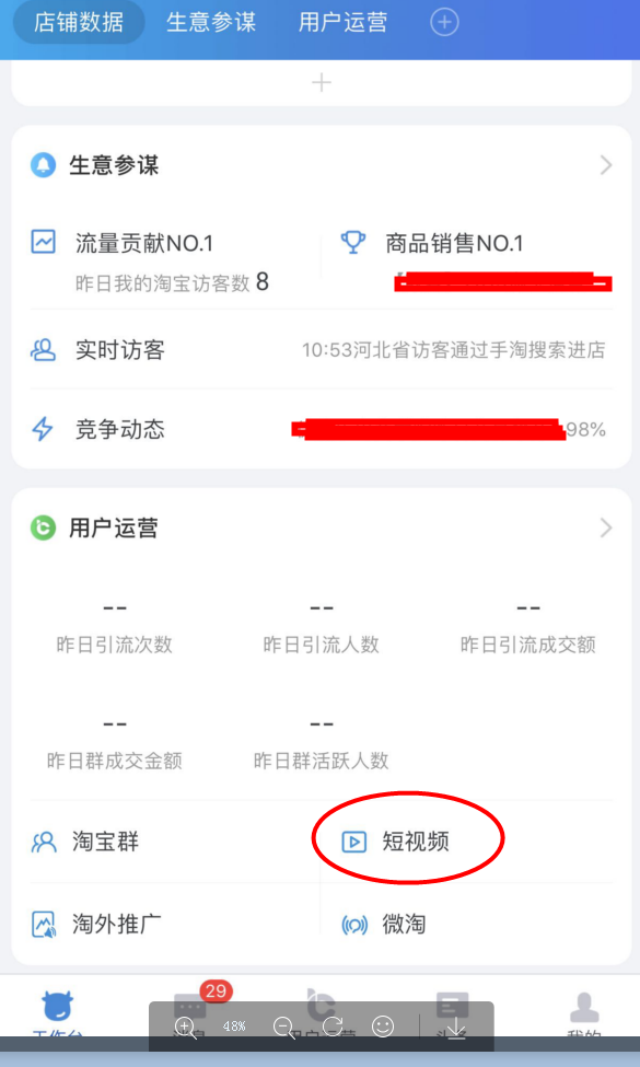 拍摄主图视频淘宝提供了一个免费的工具----淘拍软件(也是官方的拍摄视频的入口)。首先带着大家走一遍拍摄流程:打开手机千牛app----首页找到用户运营----下面找到短视频模块--点击之后就会跳入到淘拍页面如图1、如图2: