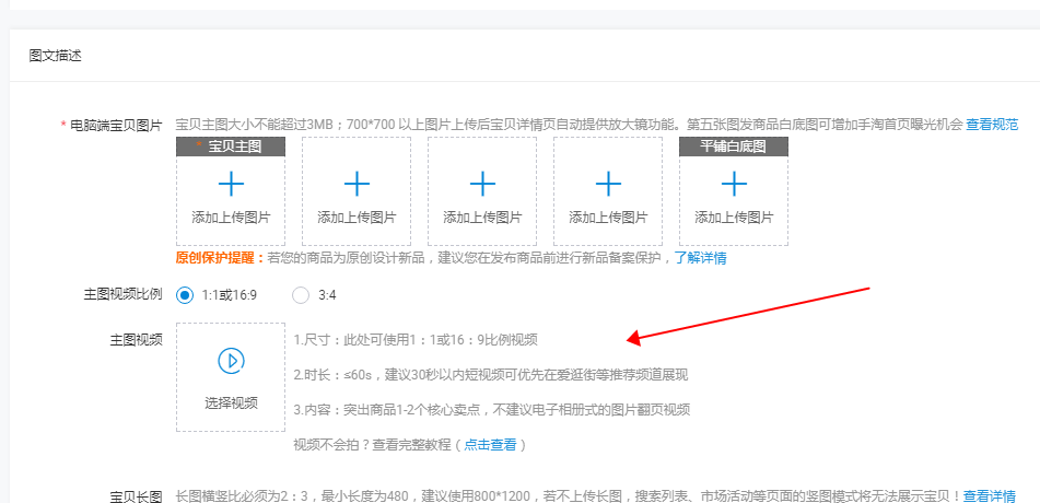 接下来主图视频保存到店铺的图片视频素材里面,然后再将视频添加到单品上,添加方式,打开单品的编辑页面,找到主图视频添加的页面。上传视频有几点注意项:如下图
