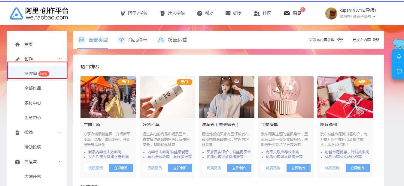 进入到这个页面看到,可以以各种形式去发布微淘,比如:帖子形式、买家秀形式、粉丝福利等等各项形式可以以更多丰富的形式去做好内容,做好粉丝运营。