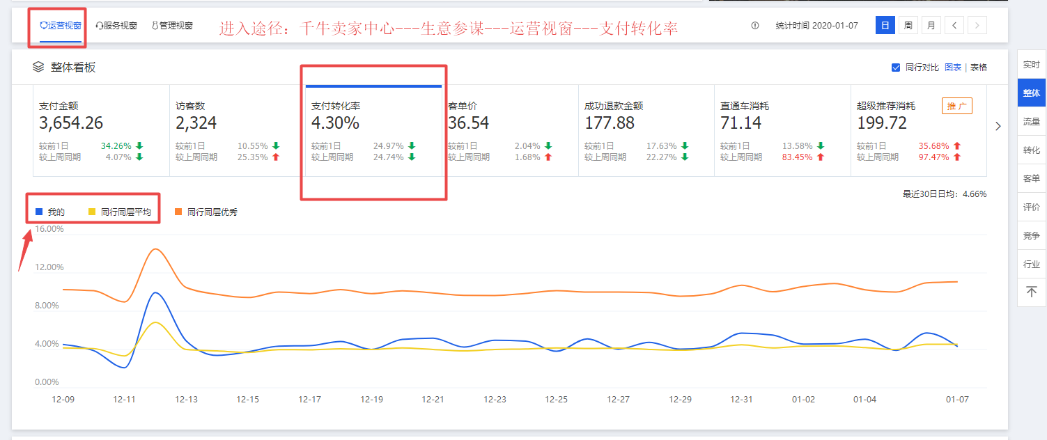 下面蓝线是自己店铺转化率情况,黄色是同行同层平均,如果蓝线一直处于黄线下面,那么需要去提升好店铺支付转化率,转化越高,说明流量精准,流量价值高,后期淘宝才会给到更多的流量。