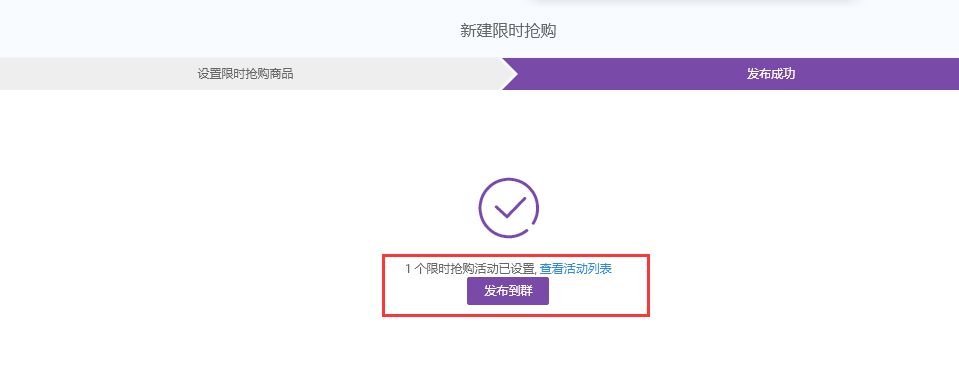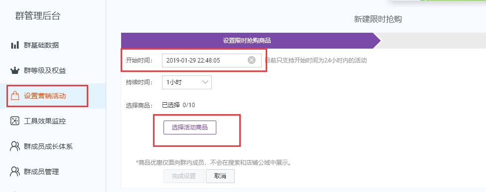 点击限时抢购,设置好活动时间和持续时长,选择好活动商品,设置活动价格,然后推送到淘宝群,促成群内粉丝成交。如图: