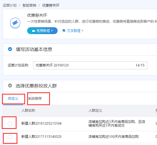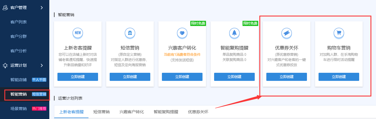 4、可以通过客户运营平台的活动促成收藏加购顾客的购买,入口:卖家中心 – 营销中心 – 客户运营平台 – 优惠券关怀及购物车营销。