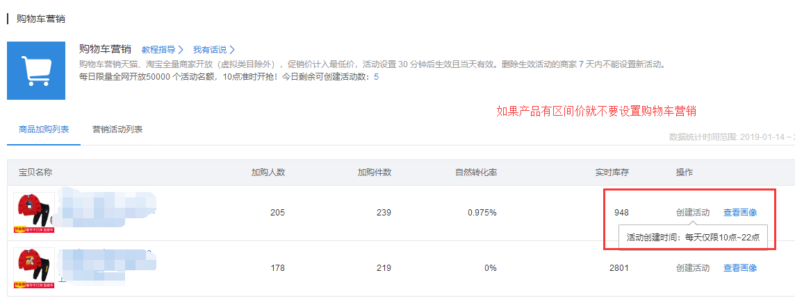 购物车营销,需要15天内加购未成交人数超过100的宝贝才可以进行设置,并且宝贝如果有区间价不要设置