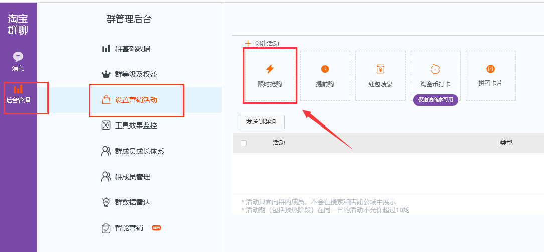 3、有淘宝群的也可以通过淘宝群的限时抢购活动来促成转化,卖家中心 – 自运营中心 – 淘宝群进入,后台管理 – 设置营销活动 – 限时抢购进去创建好活动推送给淘宝群的成员,促成群成员购买。