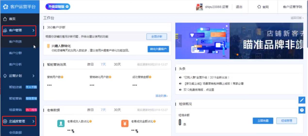 登录千牛后台,在营销中心有个客户运营平台,主要讲两点,客户管理和忠诚度管理,客户管理是淘宝官方系统去帮我们统计店铺客户的数据库,首先看一下客户列表,它把店铺的成交店铺和未成交店铺进行了全部的整理,而成交客户里面会显示成交金额、交易笔数以及店铺交易详情,详情里面会显示用户的详细信息,包括信用等级、交易时间、金额、地址等等,而未成交客户里面是不会显示客户的实名认证信息,只会显示等级,而在这里唯一能操作的是可以点击旺旺标志直接跟顾客聊天,这里的数据不是特别优异。
