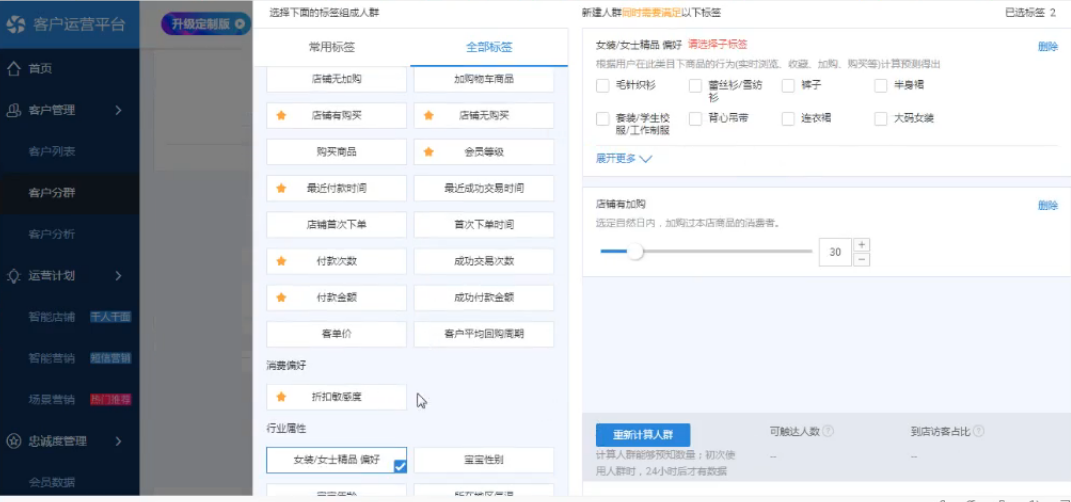 客户人群相当于客户列表的进阶版,当我们点击相对应的客户标签系统会自动的来帮助我们计算,全部标签是比较细致的,包括一些有偏好的消费者,它就是把卖家自己触达不到的人群系统通过它的数据库反馈给你,客户分析可以看到店铺一天的访客数据。