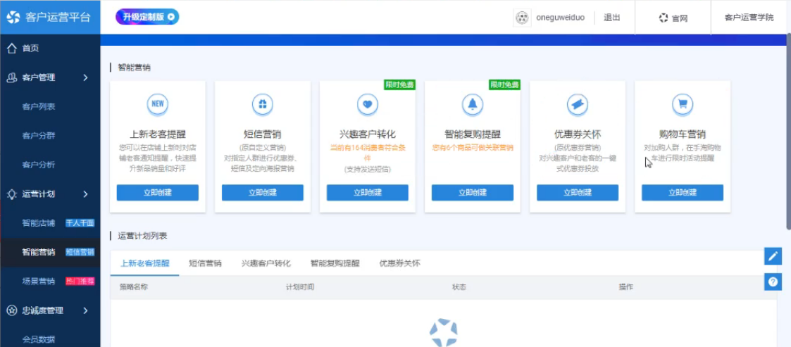 智能营销包括上新老客提醒、短信营销、兴趣客户转化、智能复购提醒、优惠券关怀以及购物车营销,上新老客提醒点击立即创建,添加优惠券,选择发短信或者海报的形式,短信营销是淘宝官方来帮卖家发送短信,也需要新建人群,中前期尽量针对一些有过购买行为和加购行为用户,反馈率会高一些,兴趣客户转化,指近3-10天内有加购或收藏且无成交的消费者,选择权益还是以优惠券为主。淘宝现在后台是越做越复杂,而这些复杂点其实就是把一些第三方服务市场的一些功能纳入到自己的体系中来,总的来说客户运营模式就是选择人群(自定义人群、系统标签人群),而系统标签人群分为精准(收藏、加购、老客户)和次要精准(没有购买过只看过),通过短信营销、店铺海报以及手淘消息push的模式来营销,店铺海报会有千人千面的影响,只有投放的人群才能看到海报,而手淘消息push会字节推送到手机淘宝消息,投放的人群会接到。