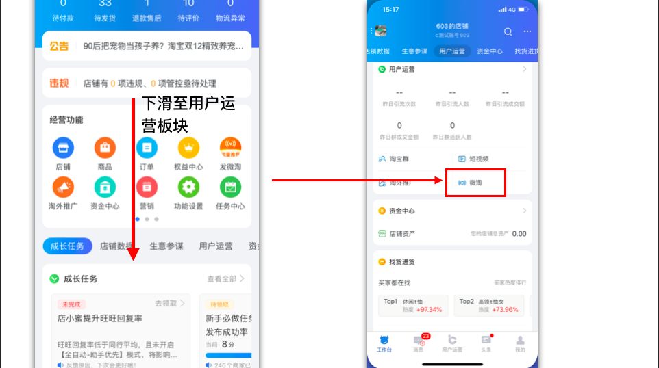 方法二:千牛APP首页下拉--找到用户运营板块--点击微淘--进入工作台