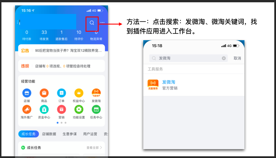 方法一:点击搜索--搜索“发微淘”--进入工作台