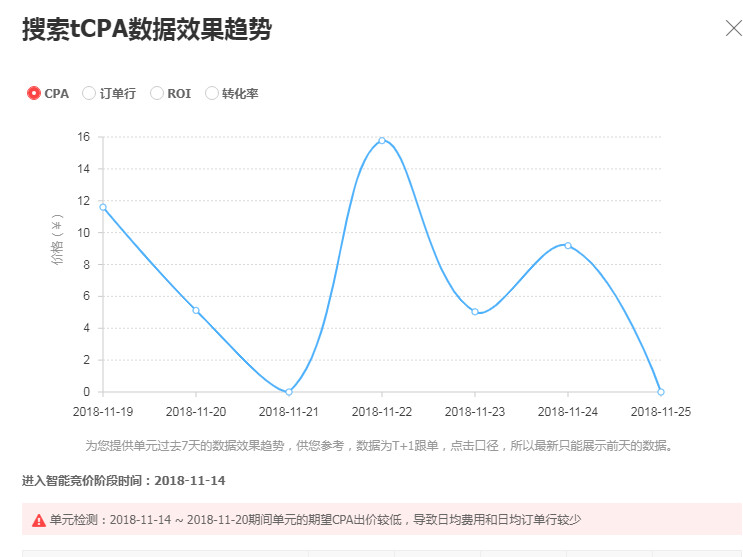 近7日数据关注:可以在推广单元点击,已关闭(未开启单元)or出价修改(已开启单元),右侧出现弹窗,查看近7日单元实际CPA,ROI等数据。