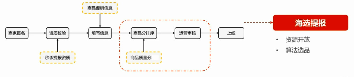 那海选提报的流程是商家报名、资质校验了之后最重要的就是我们下图圈出来的这部分区域,里面是根据商品的这种算法分来对这个商品进行打分和做排序,按照我们的审核标准来说的话就是排名越靠前,分数越高的,那你就有越高的概率去中选,这样的话就可以排除人工去判断产品好坏的这样一个因素,更多的是以客观的算法的选品方式来判断谁的商品更好谁的商品能够中选,那么海选提报的流程图如下。