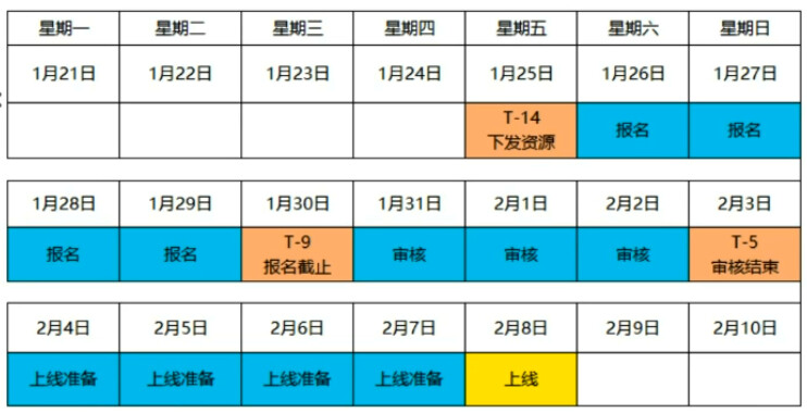 海选的报名节奏是从T-14日开始我们就下发资源位,下发资源位是分发到二级部门,分发到二级部门之后,二级部门商家会得到通知说你们部门有一个单品秒杀的坑位了,你可以进行提报了,那这个时候大家都可以参加报名,那参加报名之后只要你符合秒杀基础资质都可以报名进来,报名的时间可能会给大家留5天的时间;一直到T-9也就是1月30号时间截止,这里跟大家说的都是滚动时间,大家自己往后推就可以了,有的时候我们因为春节的因素,会把整体报名的时间提前开放,这个都会通过相应的信息触达到各位,那我们接着说,商家报名之后就会有频道运营的人员进行审核,他们审核的方式是在T-9各位报名进来之后,所有的商品都会依据商品分去对你们的商品进行打分然后进行一个排序,运营的人员在审核过程中就会依据分数的高低第一第二名依次往下审,比如说有3个坑位,那么中选的就是一二三名,有5个坑位中选的就是一二三四五,前五名,除此之外他们原则上是不能打乱任何排序的,所以说我们希望这次选品模式是非常公平的,也是非常透明的这样一个选品模式;到T-5的时候审核运营结束,这个时候哪位商家的哪个商品对应了哪个坑位,那这个结果就可以看得到了,这个时候就开始由商家准备相关的一些东西了,包括付款和一些相关的东西;最后我们会在批次开始前1小时进行缴费,随着批次的到来大家就可以顺利上线了。下面是给大家整理出来的一个时间轴,大家可以看一下。