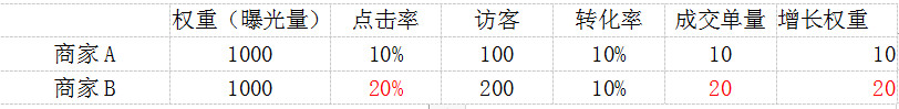 我们可以看下商家A和商家B在相同的曝光量也就是相同的权重下因为点击率商家B比商家A的高所以产生的访客和单量都比A的高。带来更多的单量也就带来了更多的权重效益。我以此类推第二天B商家就能比A商家高4倍的增长权益,慢慢的B商家会吧A商家甩开。所以点击率、和转化率都非常的重要。