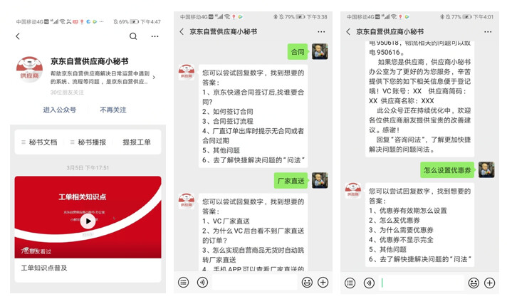 有问必答,随问随答:小秘书智能助理实时在线。一键反馈:通过小秘书公众号菜单栏“提报工单”一键反馈问题,处理进度可查。专项解答:基于供应商较为聚焦的问题,推送精选的图文或者短视频。生意视角:站在供应商生意的视角给您最贴心的解答。干货满满:实实在在的服务供应商,纯干货。新人宝典:供应商新人与京东对接的掌上宝典。