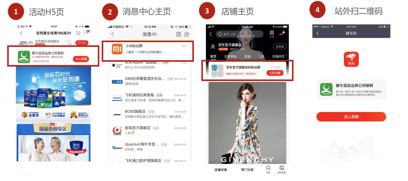 京东群聊,即店铺内私域场景下商家与目标消费者新的连接通道。在京东群聊,商家可以与用户实时互动,将店铺活动及时同步群内用户,同时借助群内专属玩法和专享权益,实现新客沉淀与老客激活。