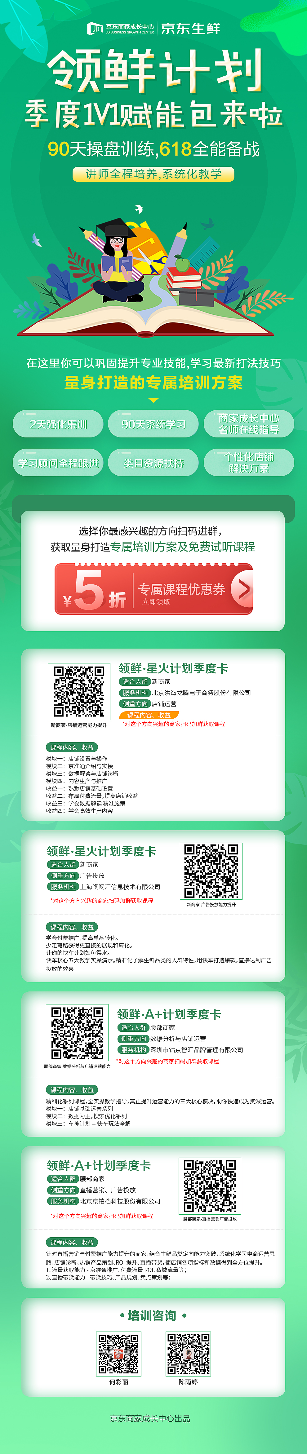 90天操盘计划是“领鲜计划”的一项重要培训内容,“领鲜计划”是生鲜类目为商家朋友定制打造的专属长期孵化方案,包含直播、互动小班集训、游学、沙龙、公开课等,同时为了更好的开发课程,为商家精选了生鲜专属讲师,范围包含京东内部讲师、ka商家讲师、机构讲师等。多元化培训模式帮助生鲜商家快速成长,提升不同层级商家的店铺运营能力以及整体竞争力,为树立生鲜行业标杆的线上线下培训项目!