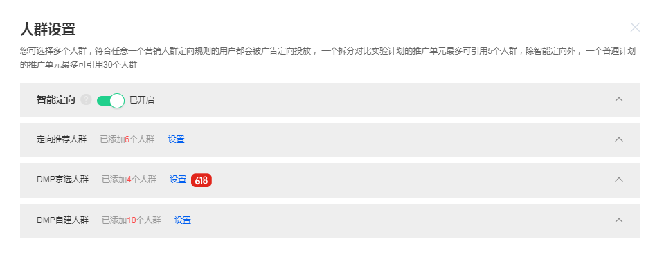 通过自己创建的人群,这样可以更精准的营销,一是可以设置DMP人群,设置好自己想要的人群,二是可以设置定向人群。之前建立的人群是可以直接拿过来进行测试的,我们在进行圈定的时候之前测试出效果好的做保留。