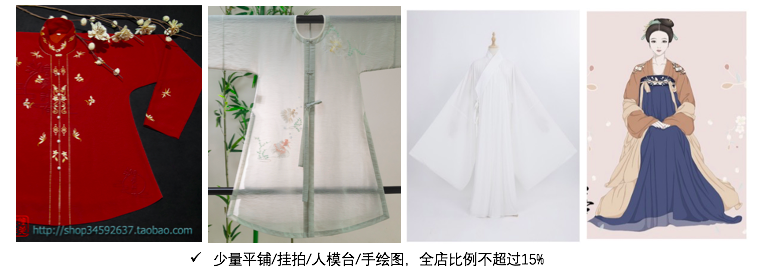 1、图片杂乱,牛皮癣严重,调性低;2、全店拼接、平铺、人台图,调性较差不符合入驻要求;3、侵权或者明显模仿平台大店拍摄等;