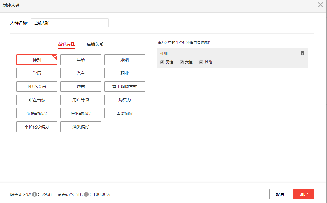 如果选了太多的标签项(目前最多支持10个),覆盖人群占比将会很低,这类人群意义就不是很大,创建的时候需注意这一点。