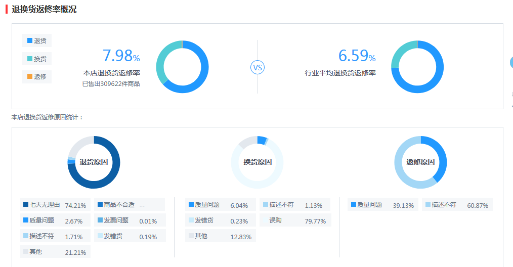 1) 退换货返修率概况:展示本店与行业退换货返修率水平,自主售后场景下本店客户申请售后服务单的原因分析;