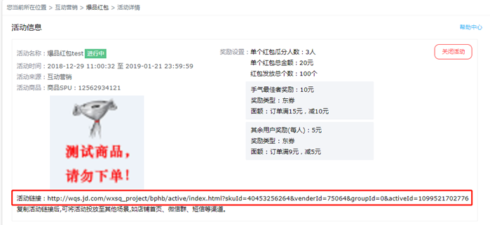 创建活动成功后,支持商家复制活动页链接投放活动于其他场景(如店铺首页、微信群、短信等渠道)