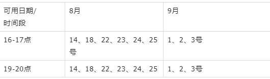 8月可兑换时间:8月14日、18、22、23、24、25、28;9月1、2、3号