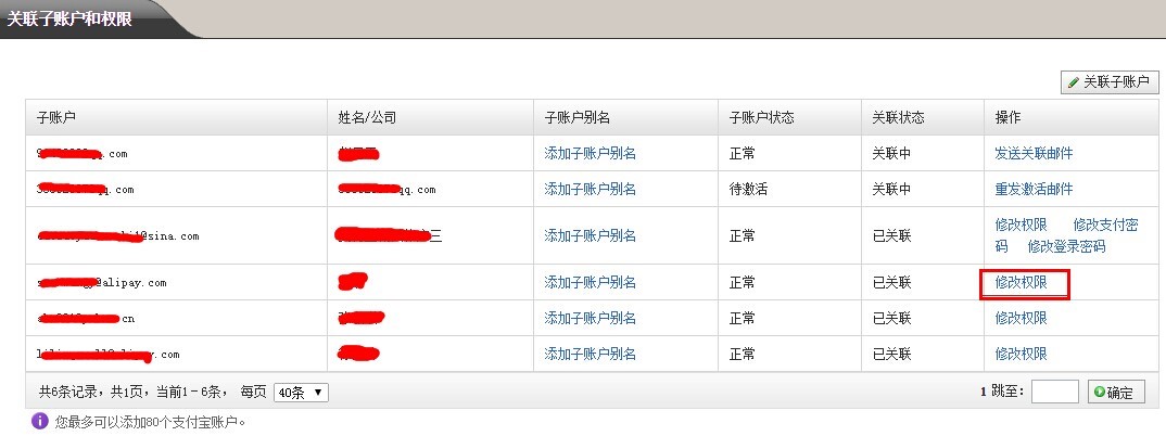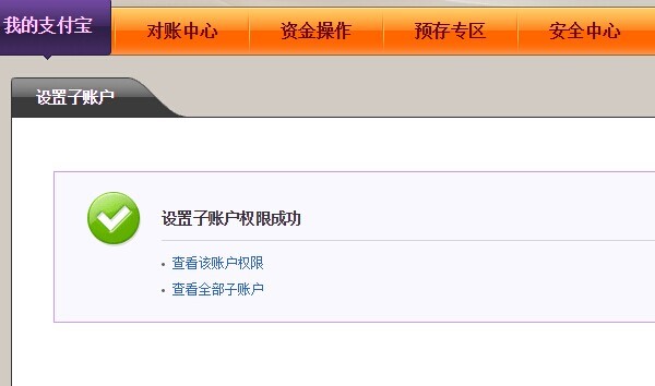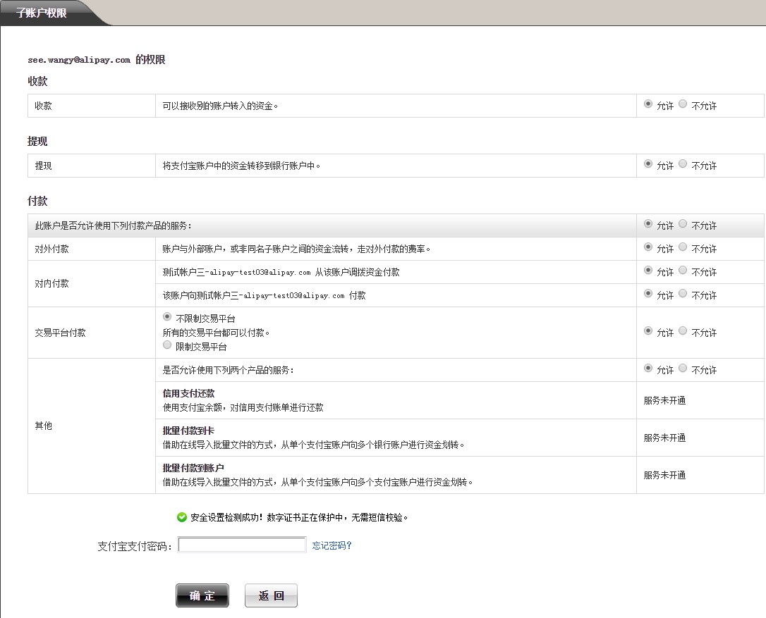 点击“我的支付宝”-“关联子账户和权限”-“修改权限”-选择是否允许相关资金操作-输入支付密码-修改成功