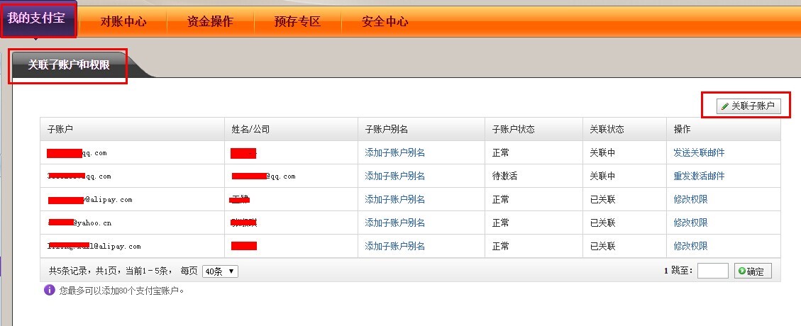 航旅版主账户(航旅专业版签约账户即为主账户)登录hl.alipay.com,点击“我的支付宝”-“关联子账户和权限”-“关联子账户”-输入被关联的子账户-确认协议-邮件激活-补全信息-关联成功。