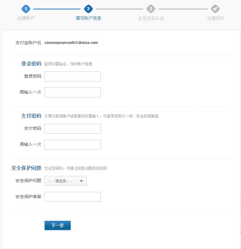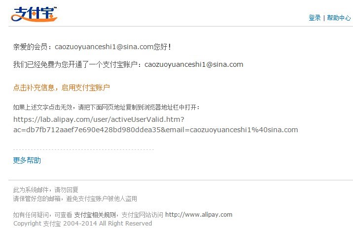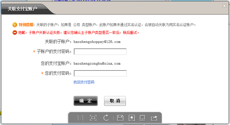 3、关联已注册未认证的支付宝账户,子账户会被自动关联成同名账户,且必须保证子账户注册时填写的相关信息与主账户一致,否则可能会报错: