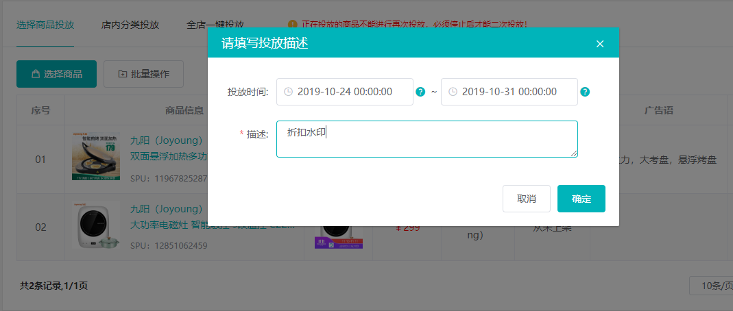 这里要特别提一下,水印的繁琐不光在于编辑和投放,还在于活动到期了得一个个去撤销。所以我们在选择软件的时候一定要选择可以设定失效时间的,像京品通这样,上面的截图中有显示。到了时间软件会自动将水印撤销,不需要我们做二次的操作,这样就可以节约大量的时间了。