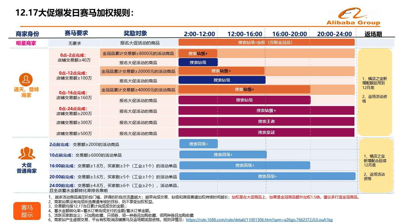 20:00前:完成交易额≥3.6万、买家数≥5个(工业≥1个)的活动单品,2:00-24:00获得搜索高级+加权,镇店之宝新增配额延用到12月底。