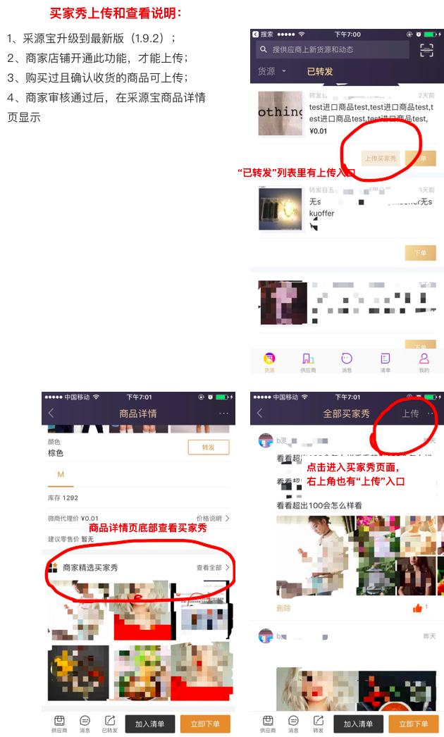 以上两种情况都满足的微商,可以打开采源宝已购买的商品买家秀详情页或已购买商品的转发记录中都可以看到上传入口。