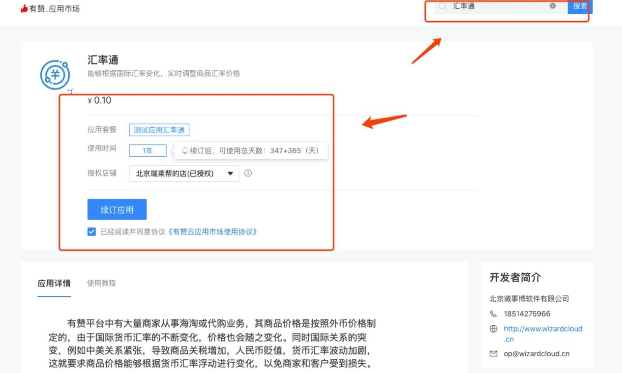 首先进入有赞应用市场,搜索「汇率通」找到应用。如果您还不清楚「汇率通」的实际功能操作,所以想试用一下该应用的话,只需要 0.1 元去订购开发者提供的试用版,即可解锁七天这款工具的所有功能。