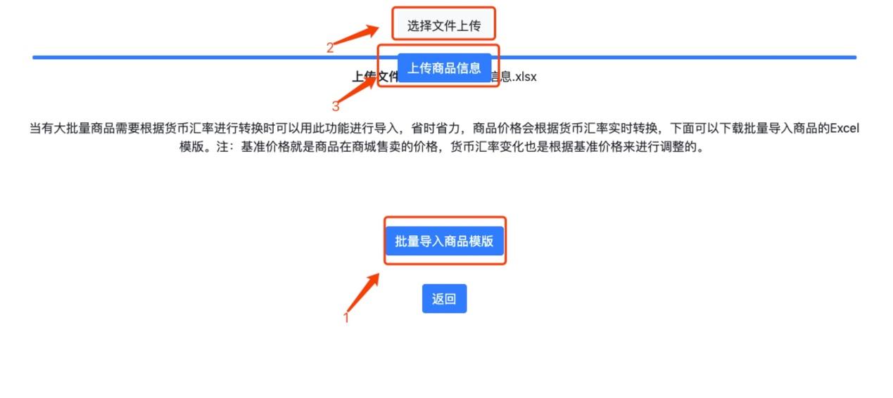 1、首先点击【批量导入商品模版】下载模版,根据批量导入商品模版填写自己的商品数据,只需要操作一次就能熟练,之后点击【选择文件上传】按钮选择自己刚填好的文件,然后点击【上传商品信息】按钮进行上传。