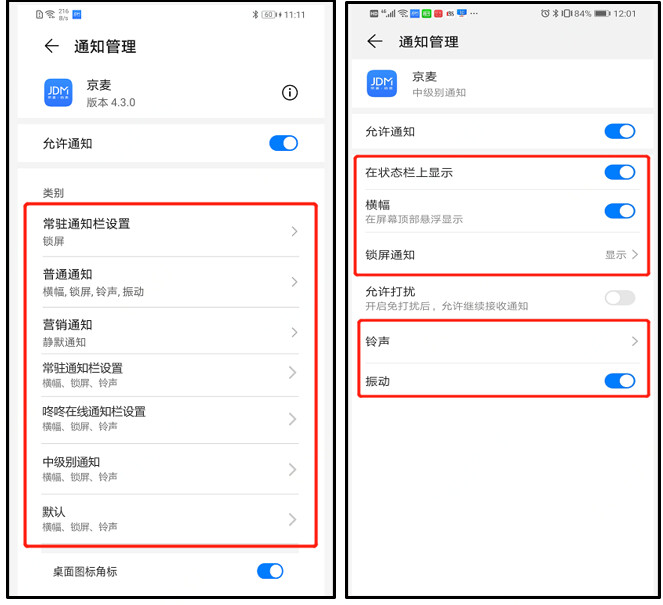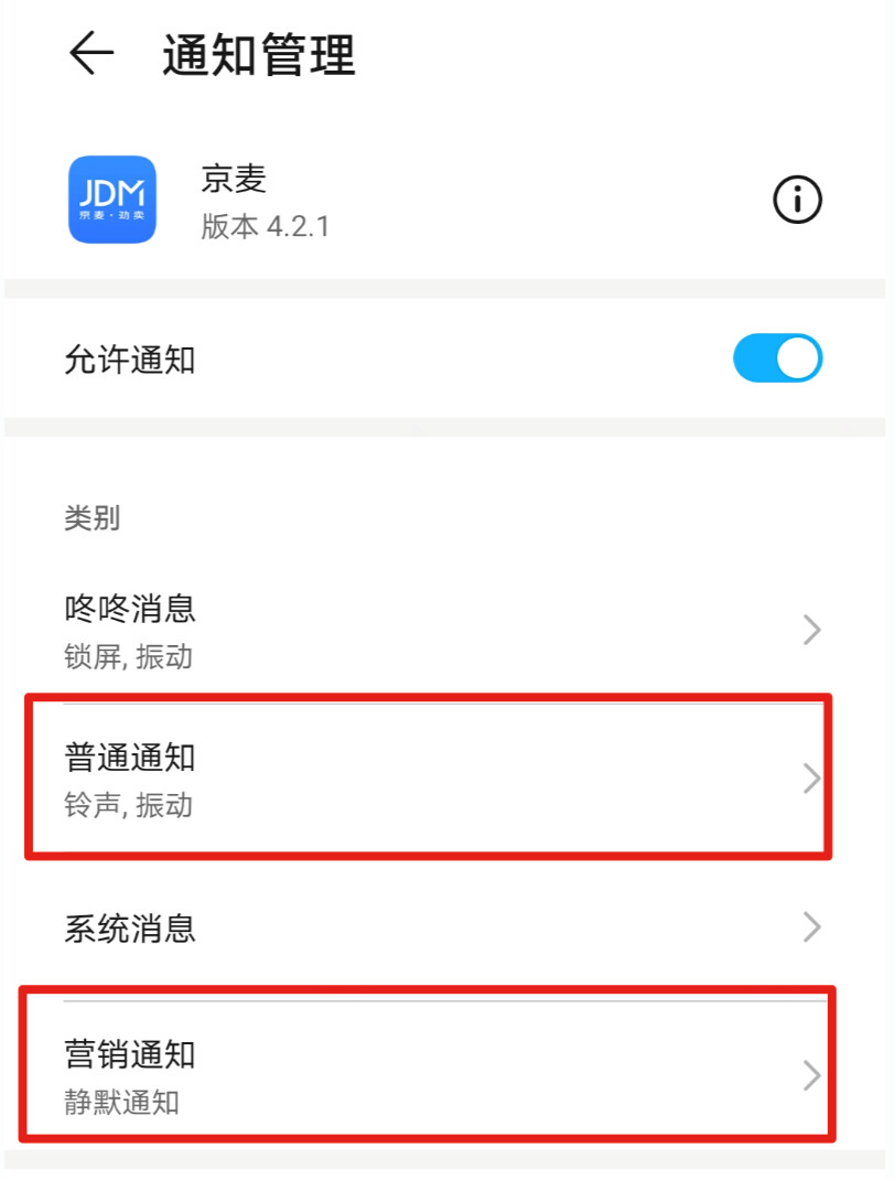 原因:华为厂商将京麦应用的消息归类为营销通知,此类消息默认静默通知(只弹通知栏,不提醒),如下图: