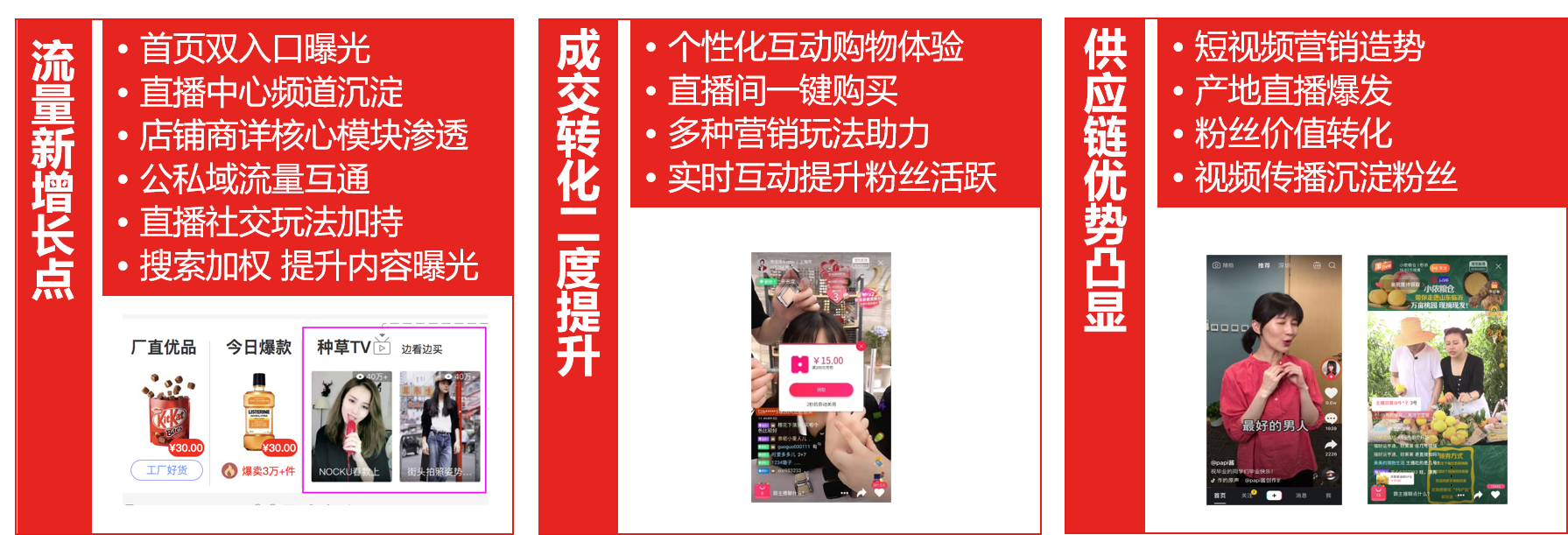 重点打造探厂直播标杆(带动产业带商家万单销量)、供货直播标杆(转化率及互动率历史峰值)、商家自播标杆(直播占比店铺成交提升),为商家及合作伙伴注入更多信心,帮助商家实现全平台健康增长。