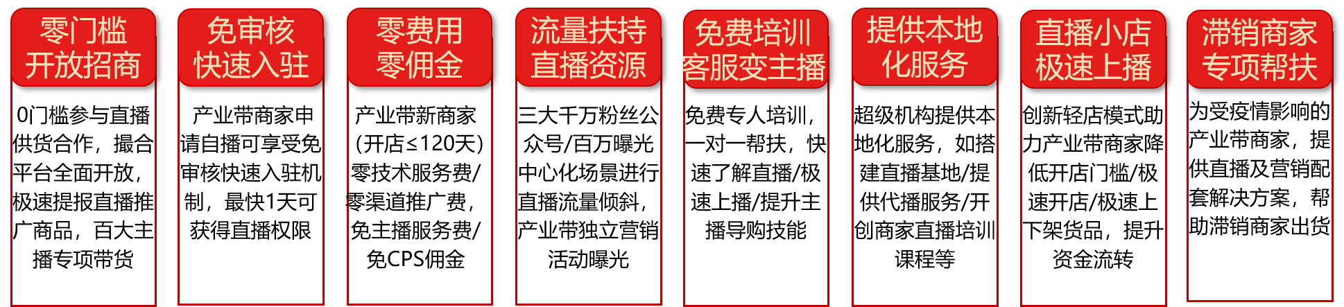 八大政策助力商家快速恢复生意,推出 “零门槛、零佣金、免审核” 等商家利好计划!