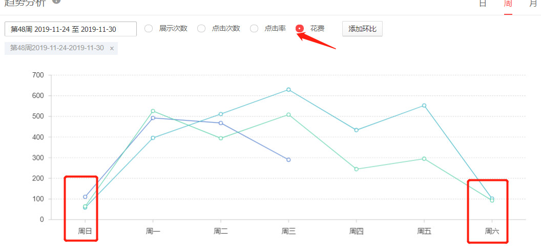 像海水潮起潮落有一个周期,通过数据分析我们可以很明确的看出每到周末展现、和花费都呈现下降趋势,而周一至周五展现、花费又快速上升趋于平稳,从订单量上看周末与工作日是1:10;这是为什么呢?因为办公产品主要成交人群是公司、事业单位、学校,而这些单位普遍是周一至周五上班,周末双休,才造成这种现象。