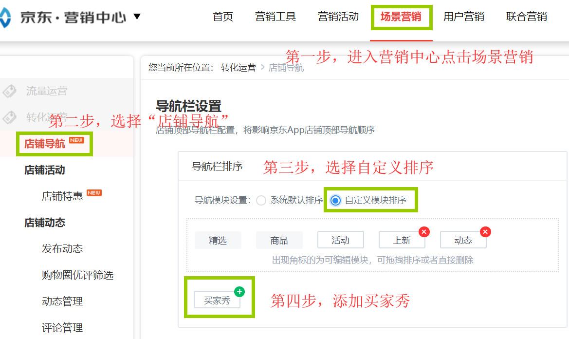 1. 登陆商家后台,进入“营销中心“,选择顶部导航的“场景营销”