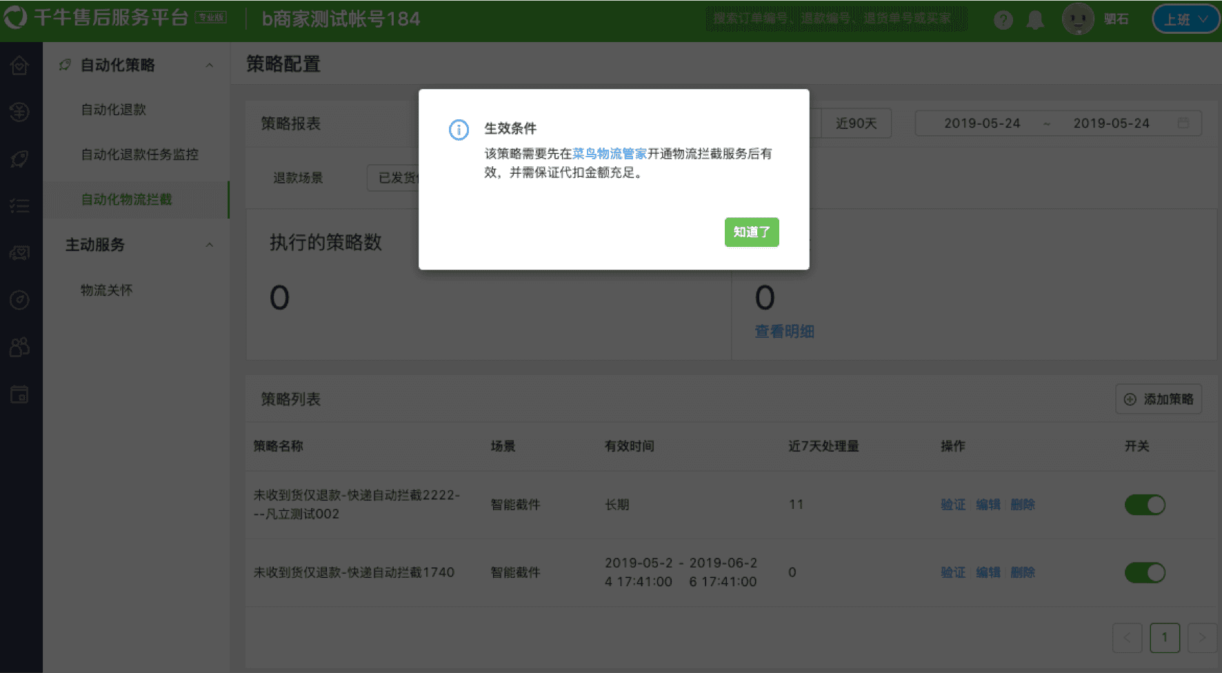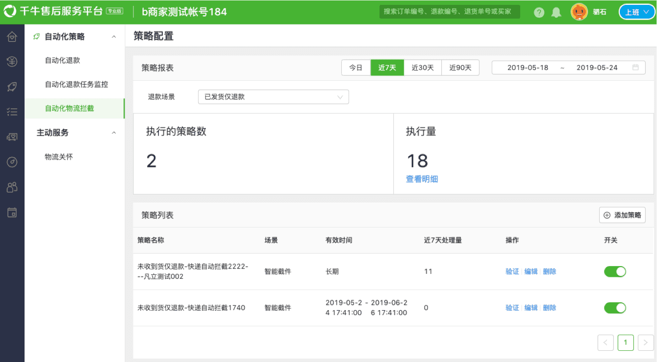 拦截成功自动退策略设置:点击策略中心à自动化退款à添加“未收货仅退款”策略设置拦截成功后自动退款策略