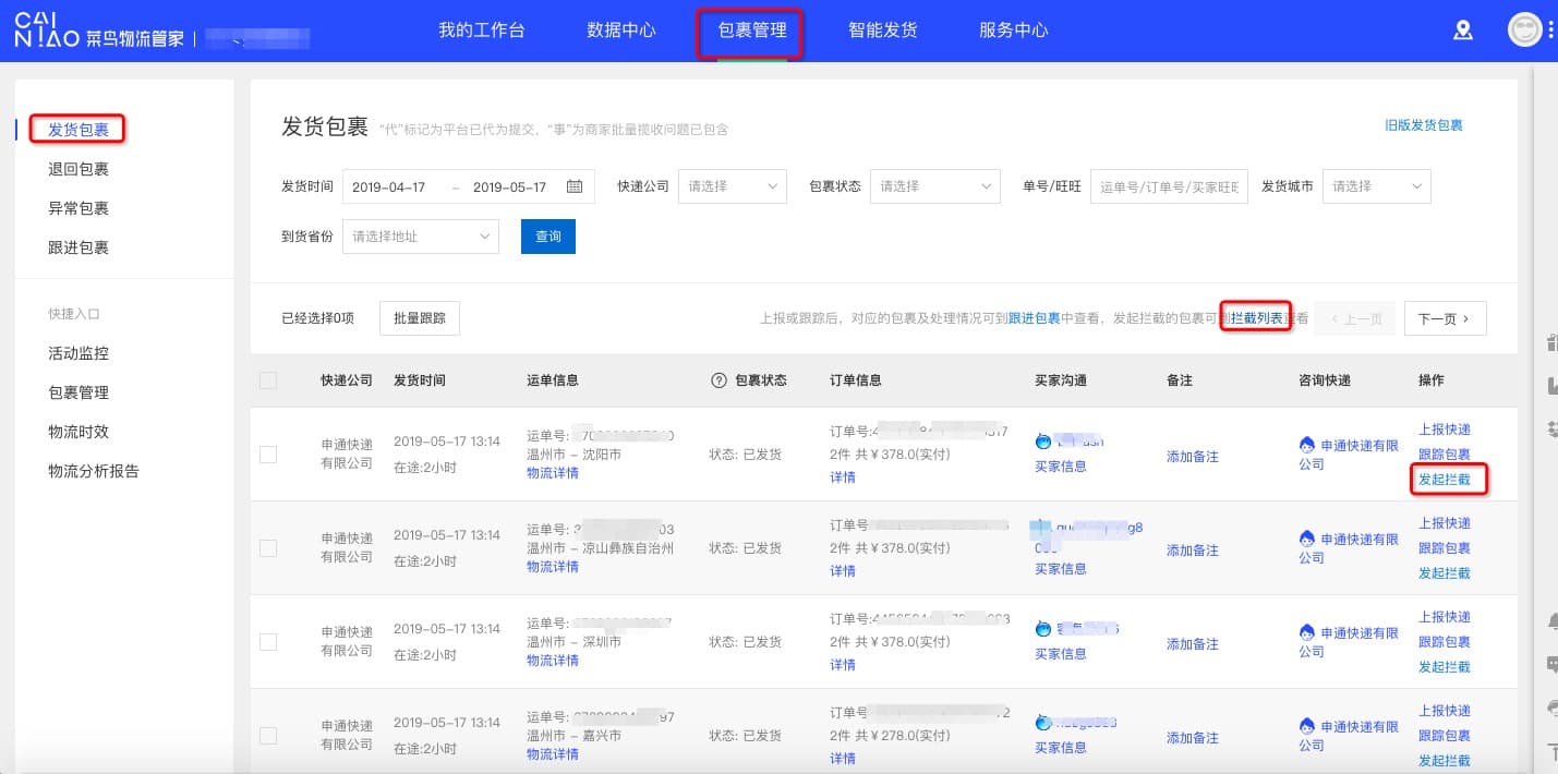 2.手动拦截:可以在退款的页面找到要退款需要发起拦截的订单,然后进入物流管家-包裹管理(z.cainiao.com)-发货包裹通过运单号搜索,一键点击“发起拦截”,发起拦截成功后,可点击拦截列表里面进行查看具体情况