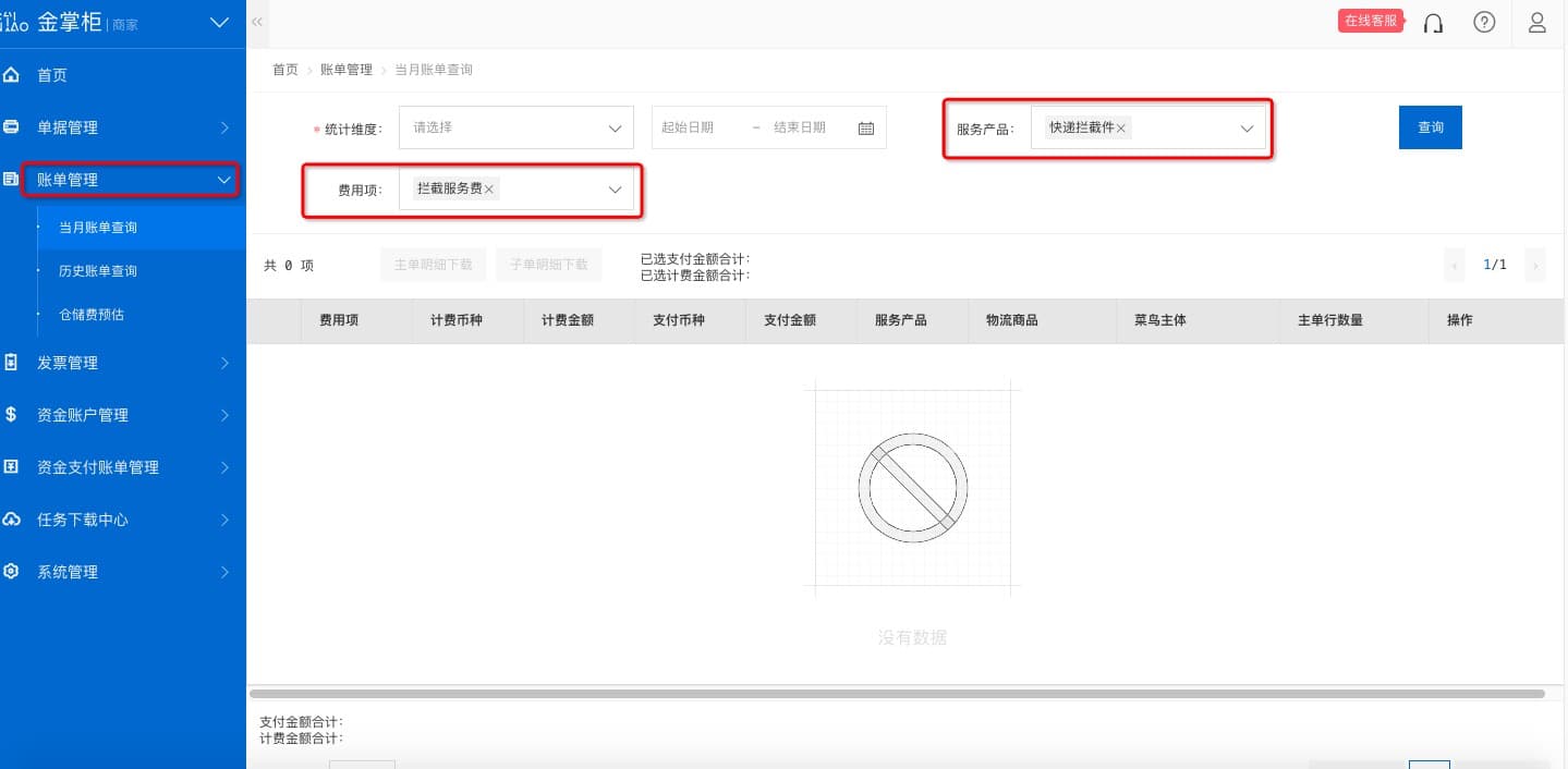 商家可以在物流管家—拦截件服务—拦截管理列表—对账明细里面查看所有的付费和赔付记录