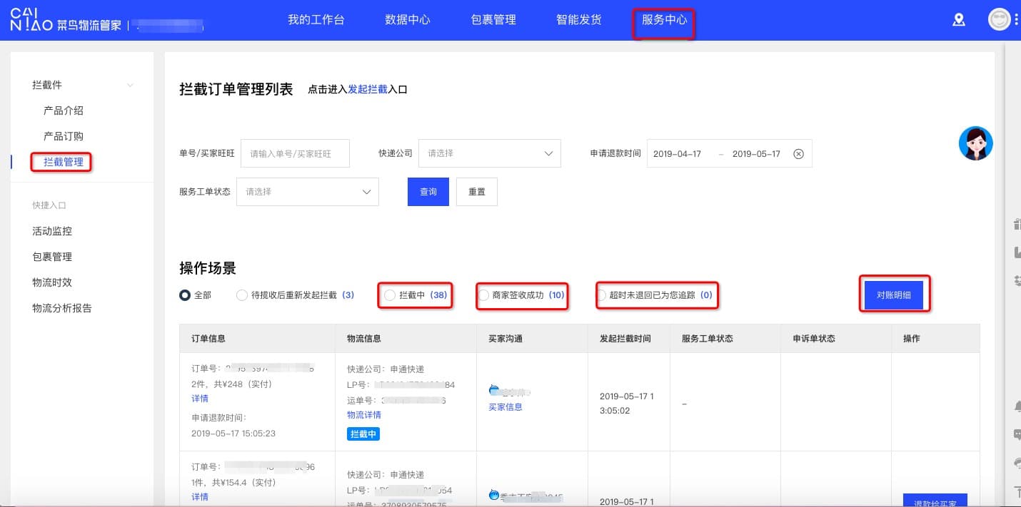 5. 进入物流管家(z.cainiao.com)-服务中心-拦截件-拦截管理里对发起拦截的订单进行查看跟进